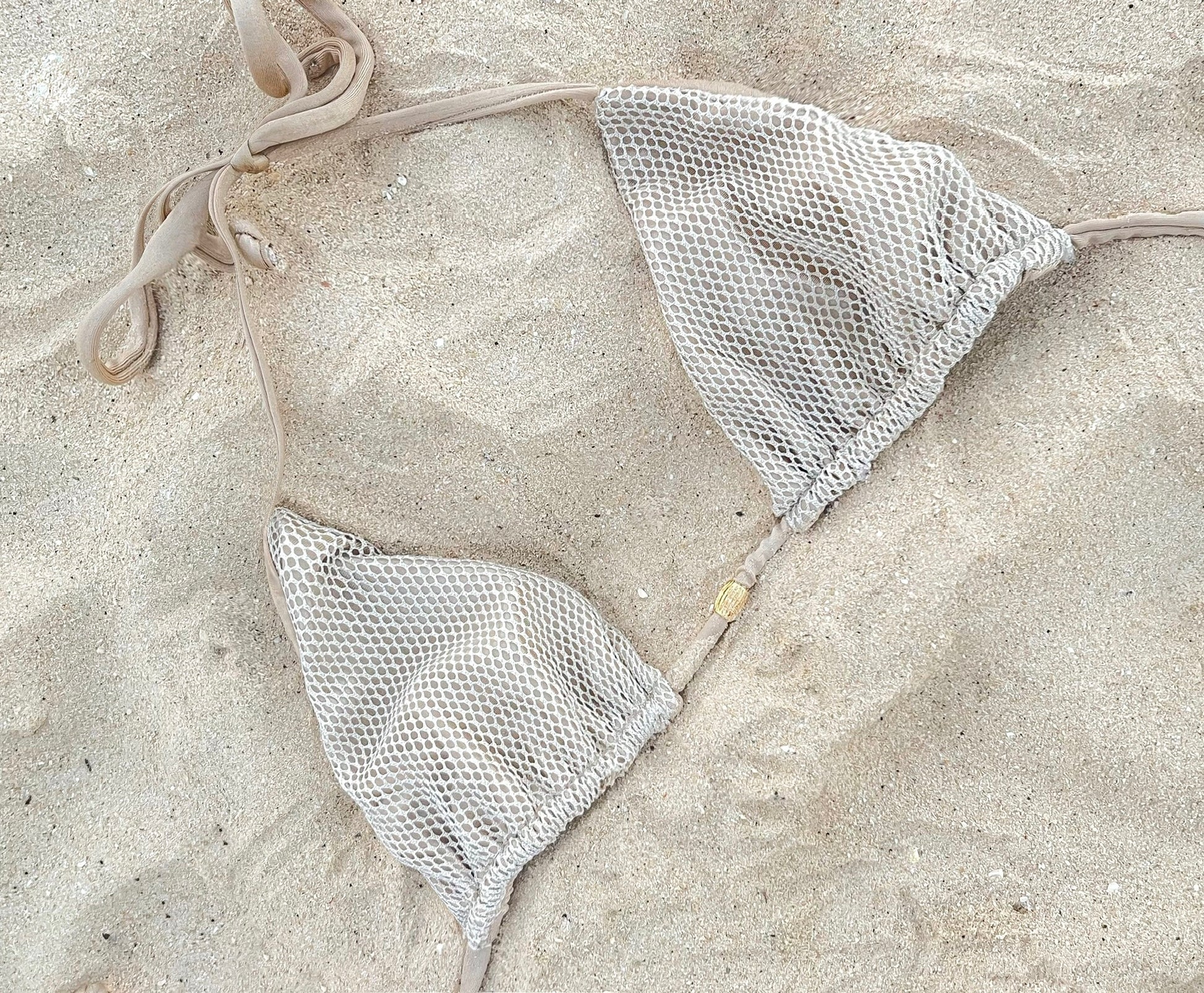 Meet the Lucia Bikini Top – a blend of sophistication and Y2K Hollywood glamour. Crafted from pearl white netting adorned with a luxurious white gold fabric and golden beading, this bikini top is more than swimwear; it's a fashion statement.